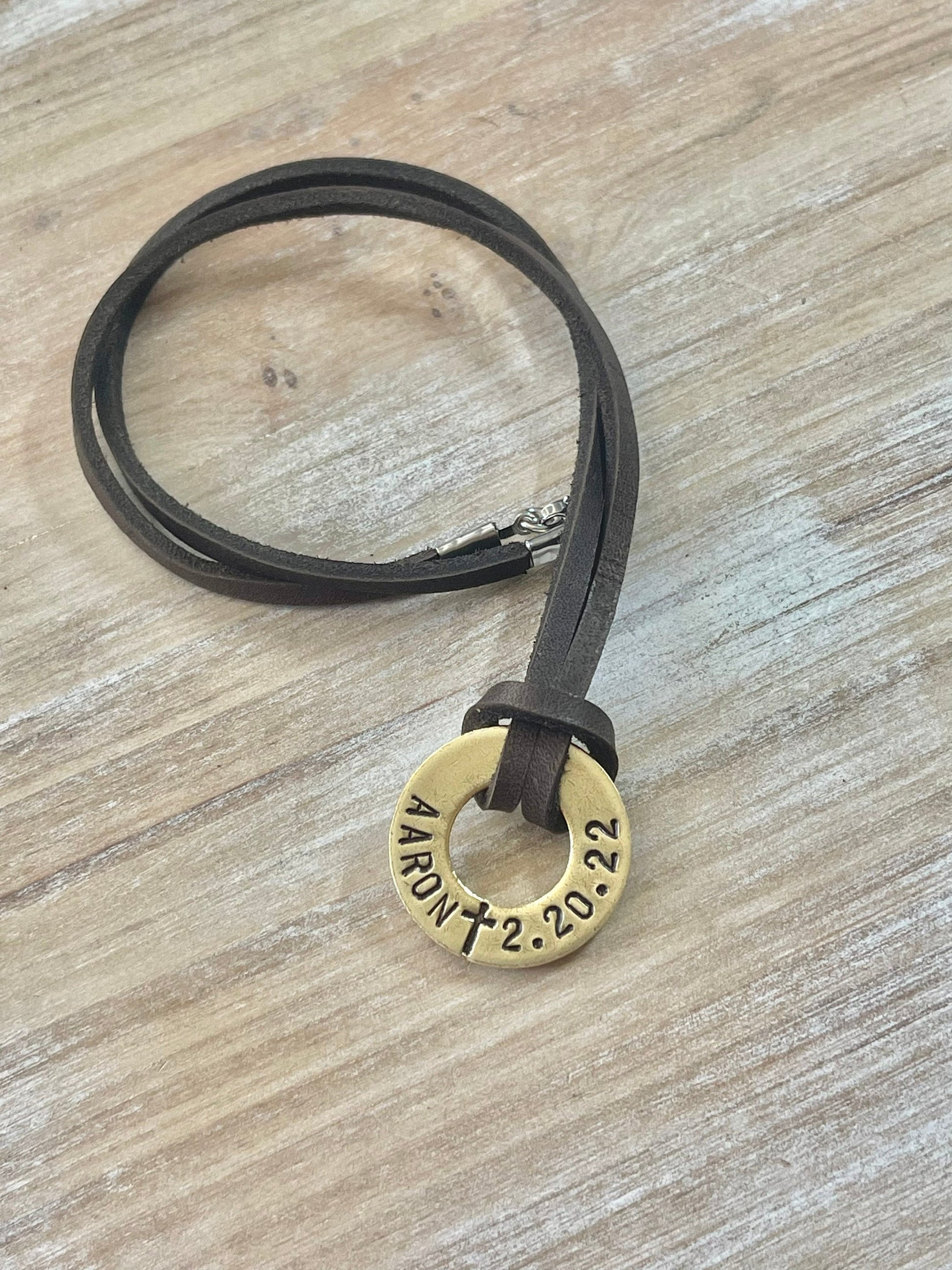 * A 1" Brass Washer stamped with "Name” and date of choice separated by a cross.