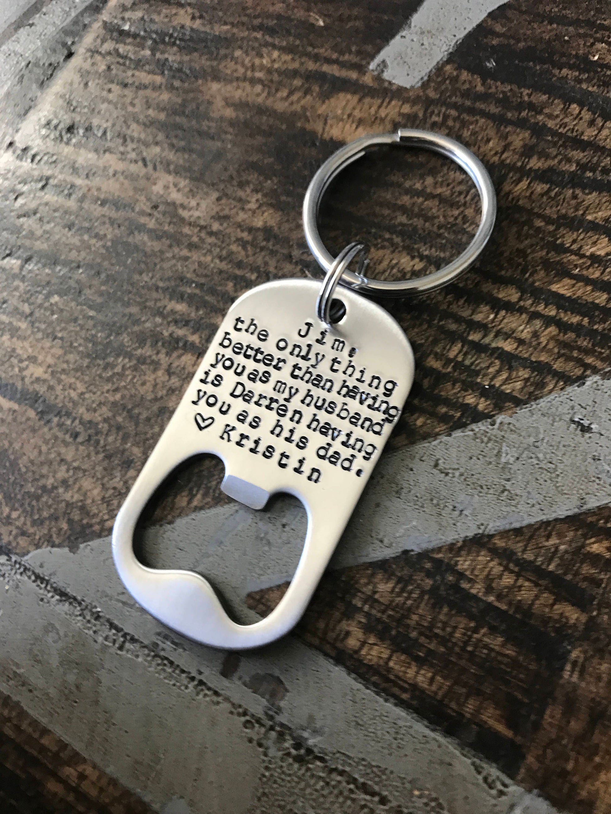 This Bottle Opener Keychain is handstamped and personalized for the Dad in your life. Make that special Dad feel on top of the world with a personalized keychain stamped with their name, Child's name, and Spouse's name.