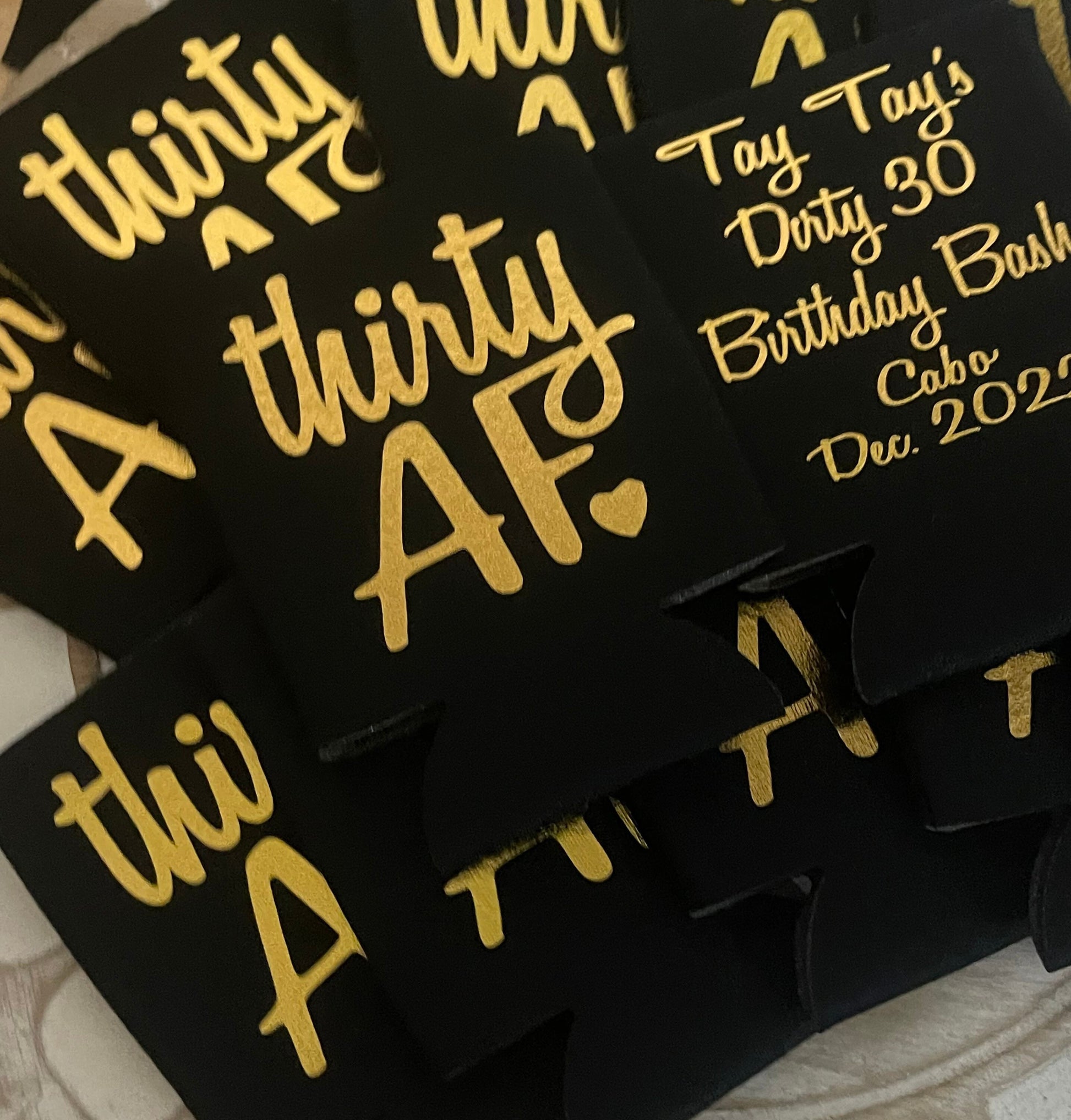 These Personalized Dirty 30 Can Coolers are the perfect keepsakes for your friends to remember your special day. Cheers to a fun and memorable Birthday Party! Listing includes your personalized details in color of choice.