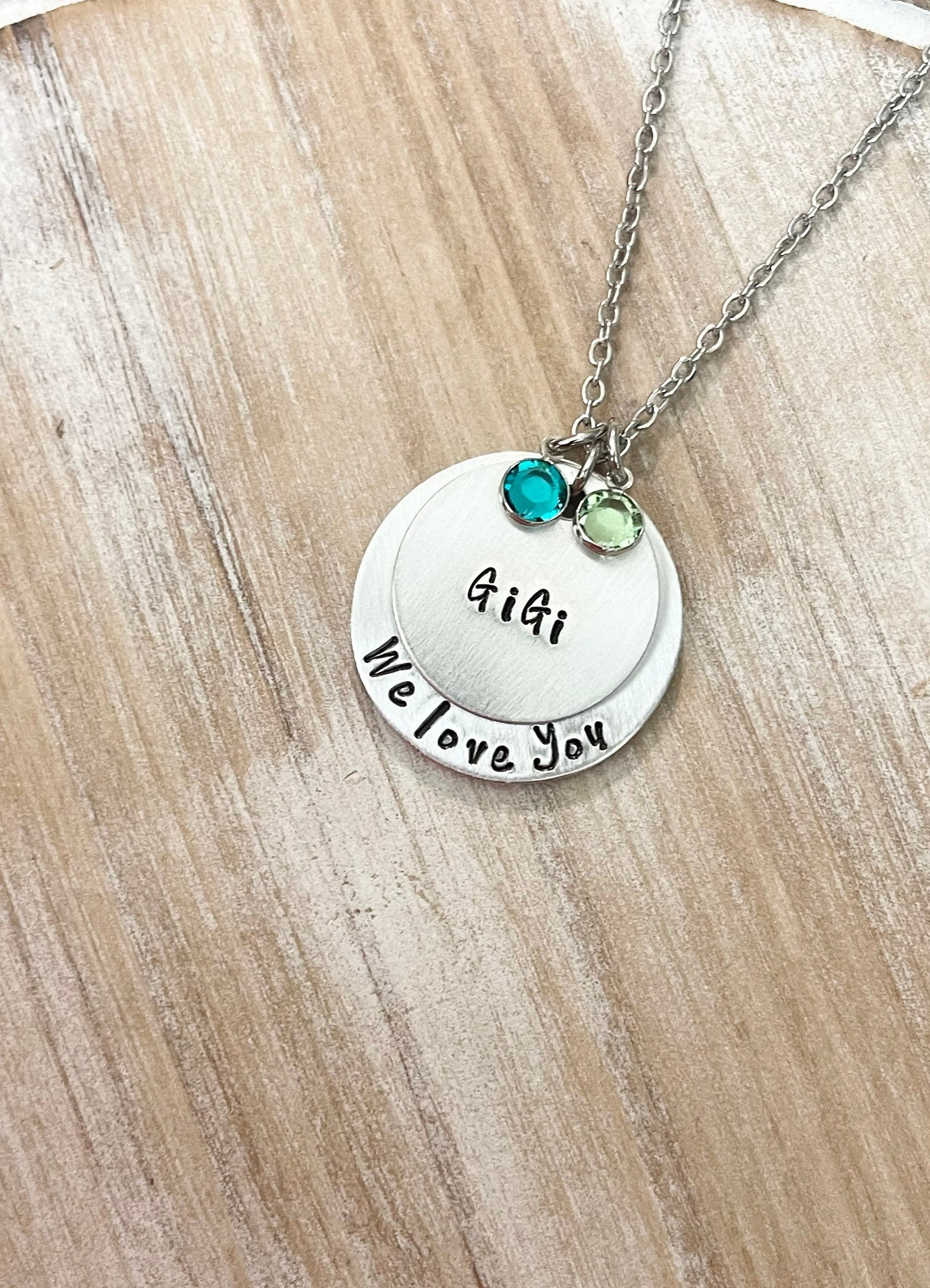 *This Handstamped Gigi necklace is personalized with "We love you" and with birthstones of grandkids.