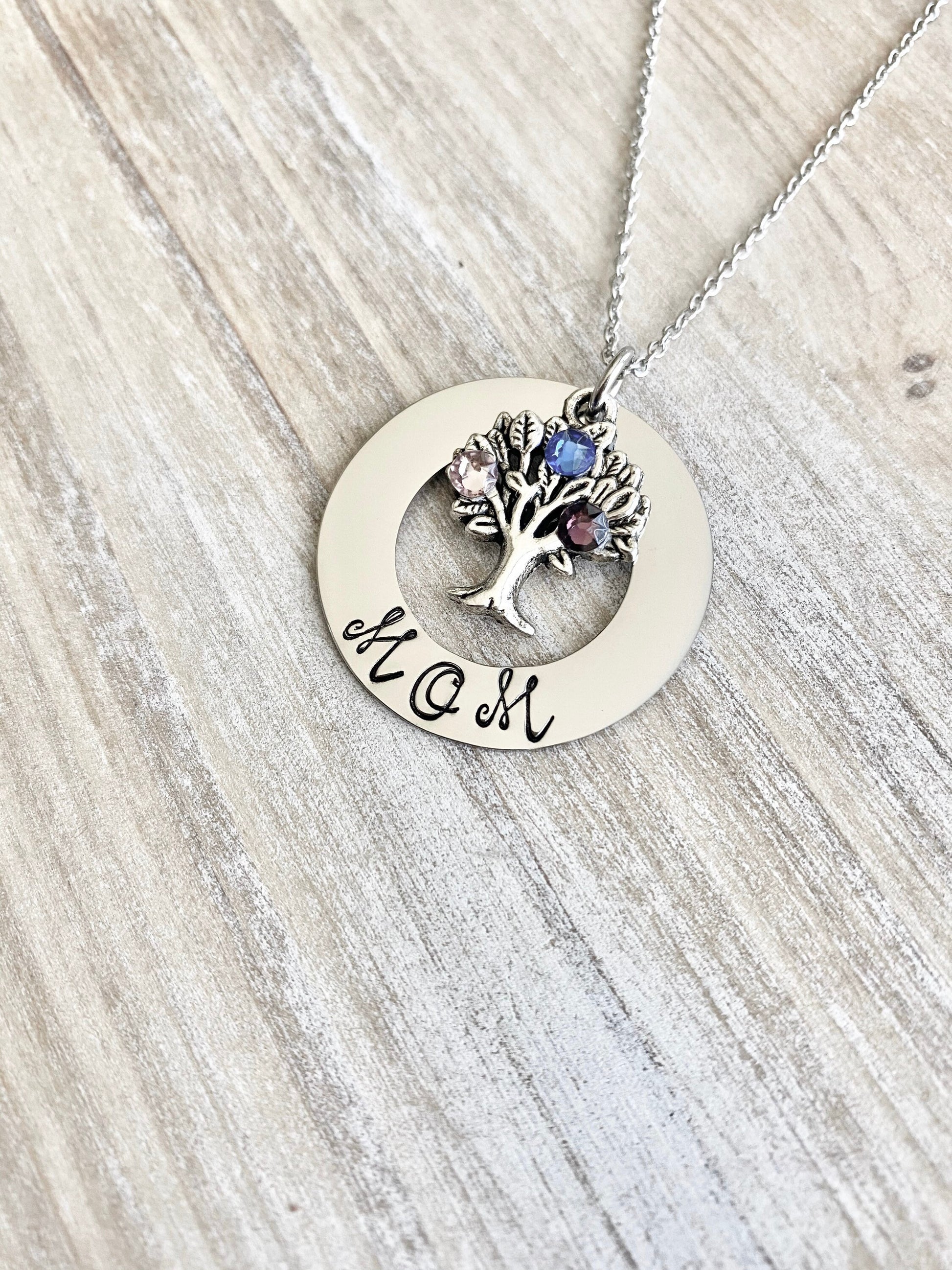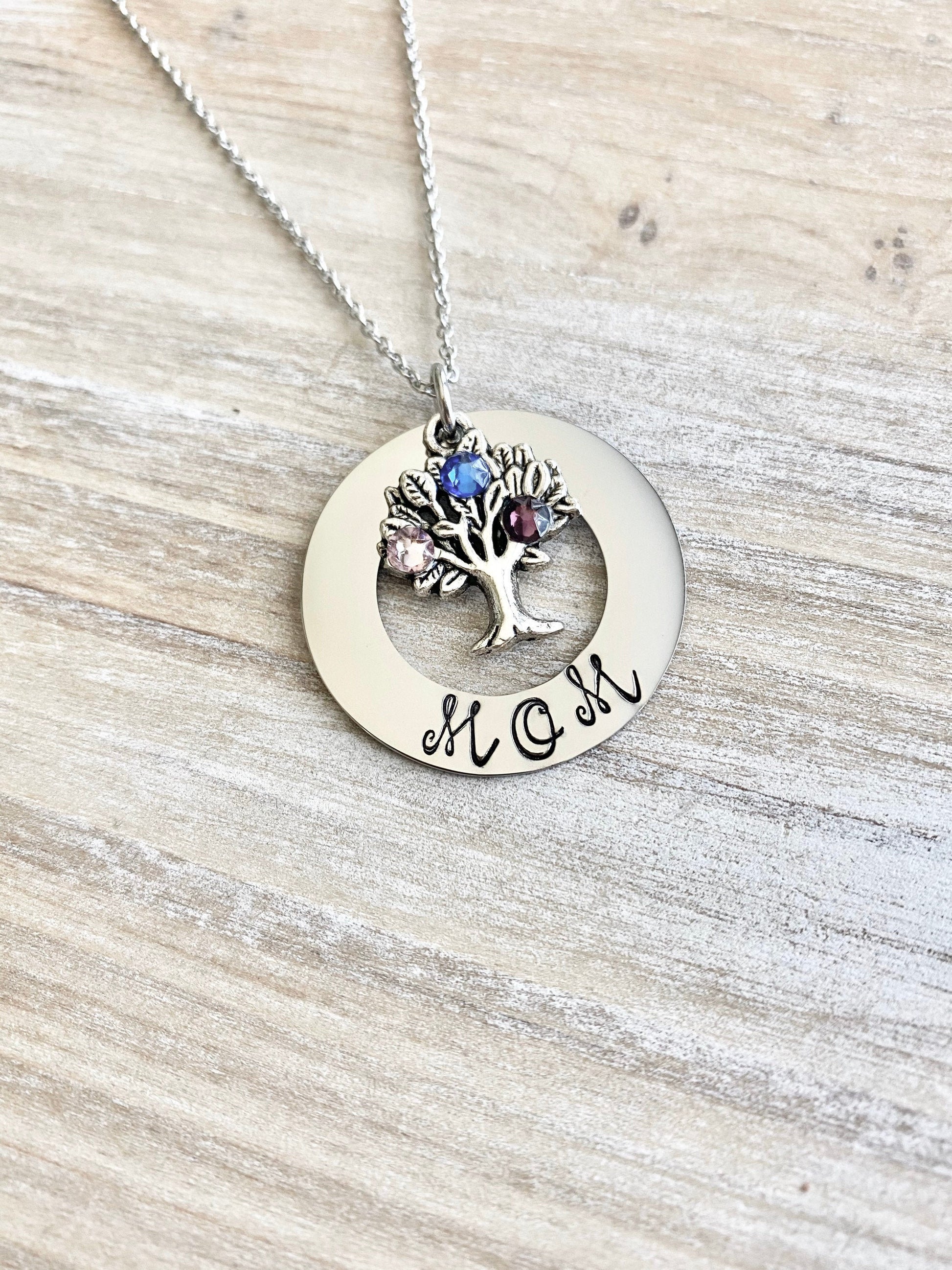 This Mom Necklace makes the perfect gift for that special person in your life. It has the "name of choice" . A silver Tree charm is accessorized with the birthstones of your choice.