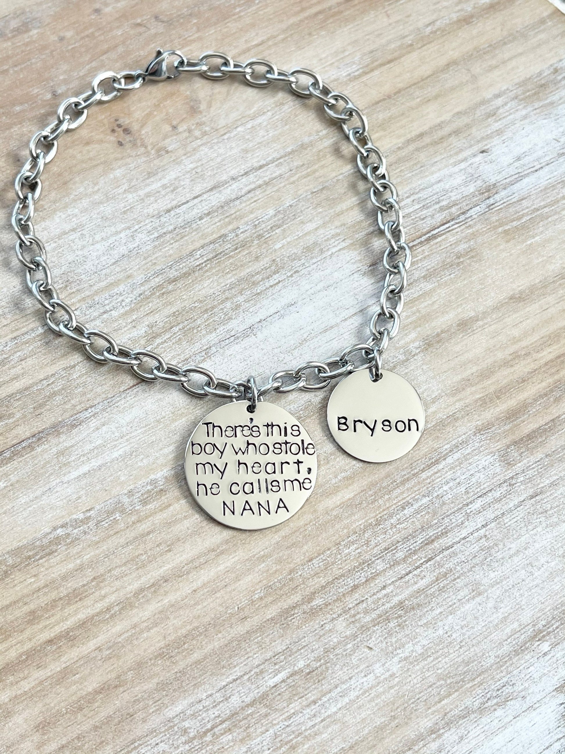 Nana Bracelet Theres this boy who stole my heart Handstamped Bracelet Personalize Jewelry Mothers Day Gift Grandma Jewelry Custom Bracelet