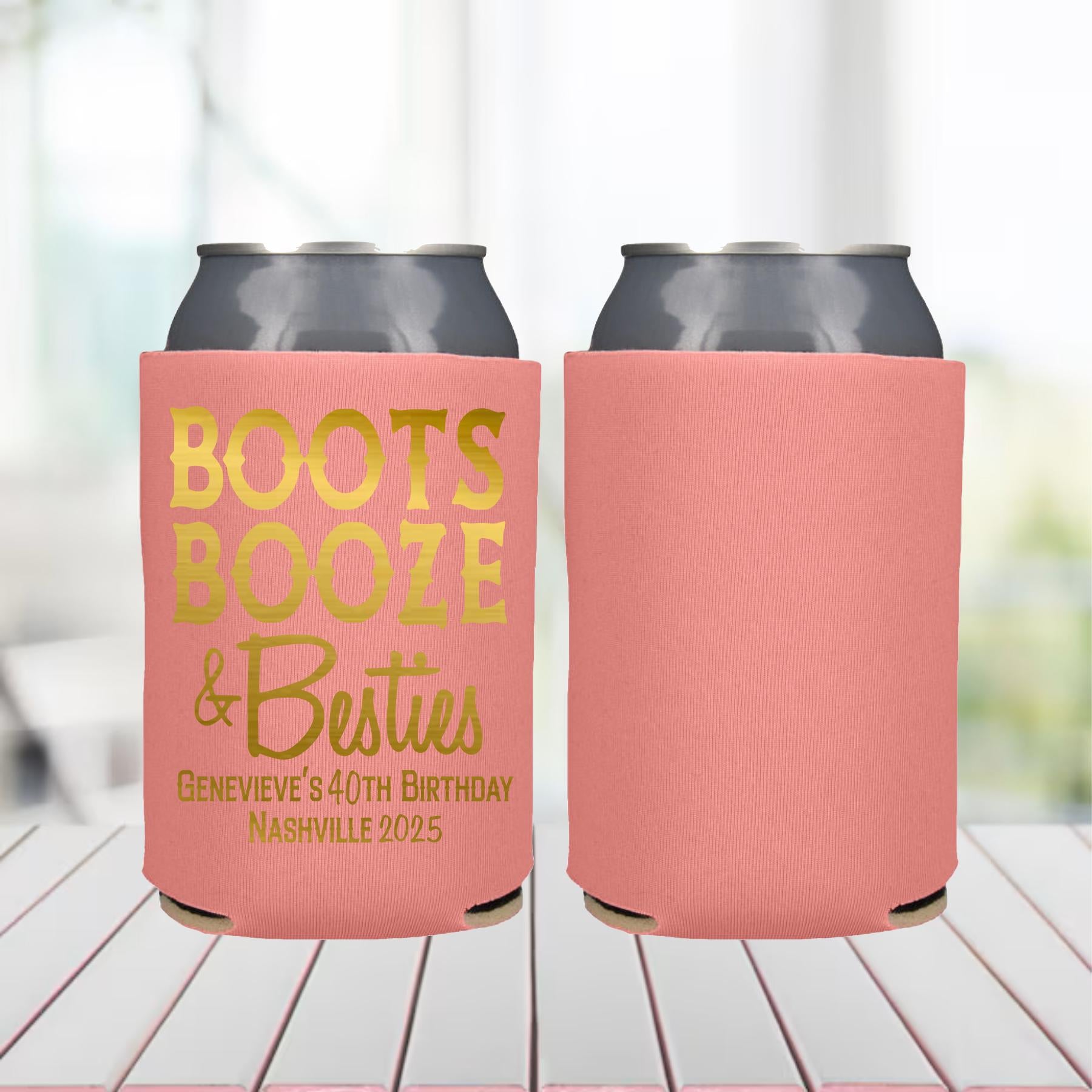 These Personalized Boots Booze & Besties Can Coolers are the perfect keepsakes for your friends to remember your special day. Cheers to a fun and memorable Bachelorette Party or Birthday Party! Listing includes your personalized details in color of choice.