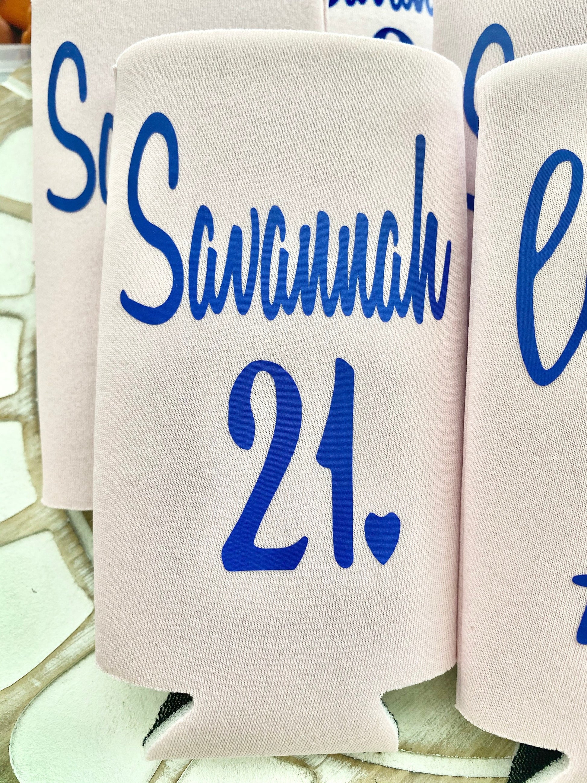 - 1 Personalized can cooler in color of choice and 1 font color.