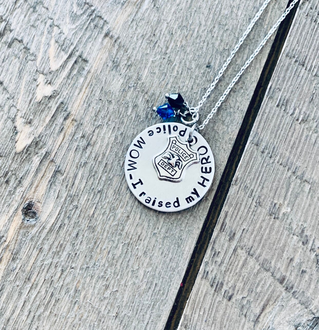 *Handstamped Police Mom necklace with police shield and black and blue stones.