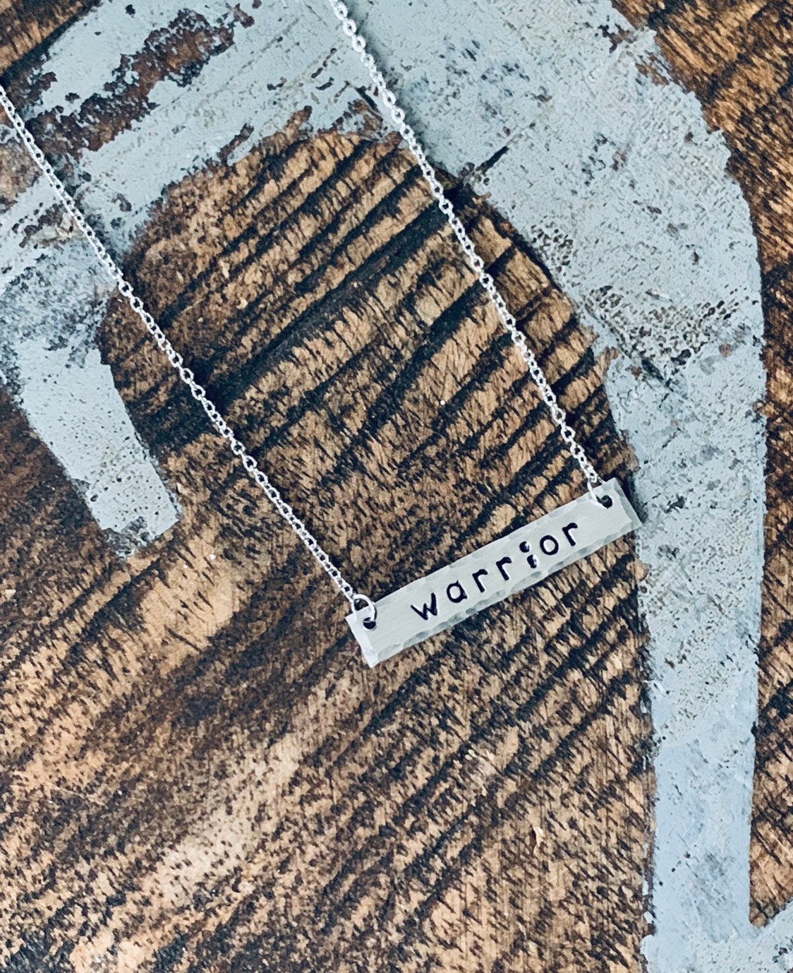 An Aluminum bar is hand-stamped with “warr;or” This will make the perfect gift for the special woman in your life.