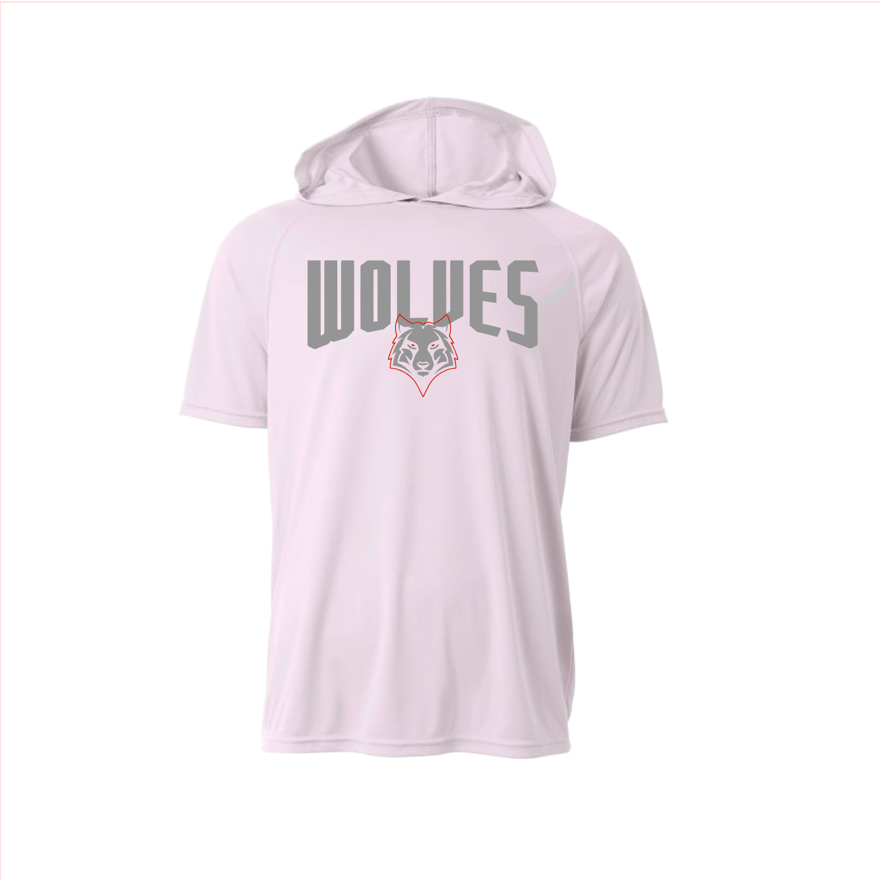 White Hooded Wolves Baseball Shirt, Short Sleeve Hooded Tee, Wolves Logo'd Baseball Spiritwear